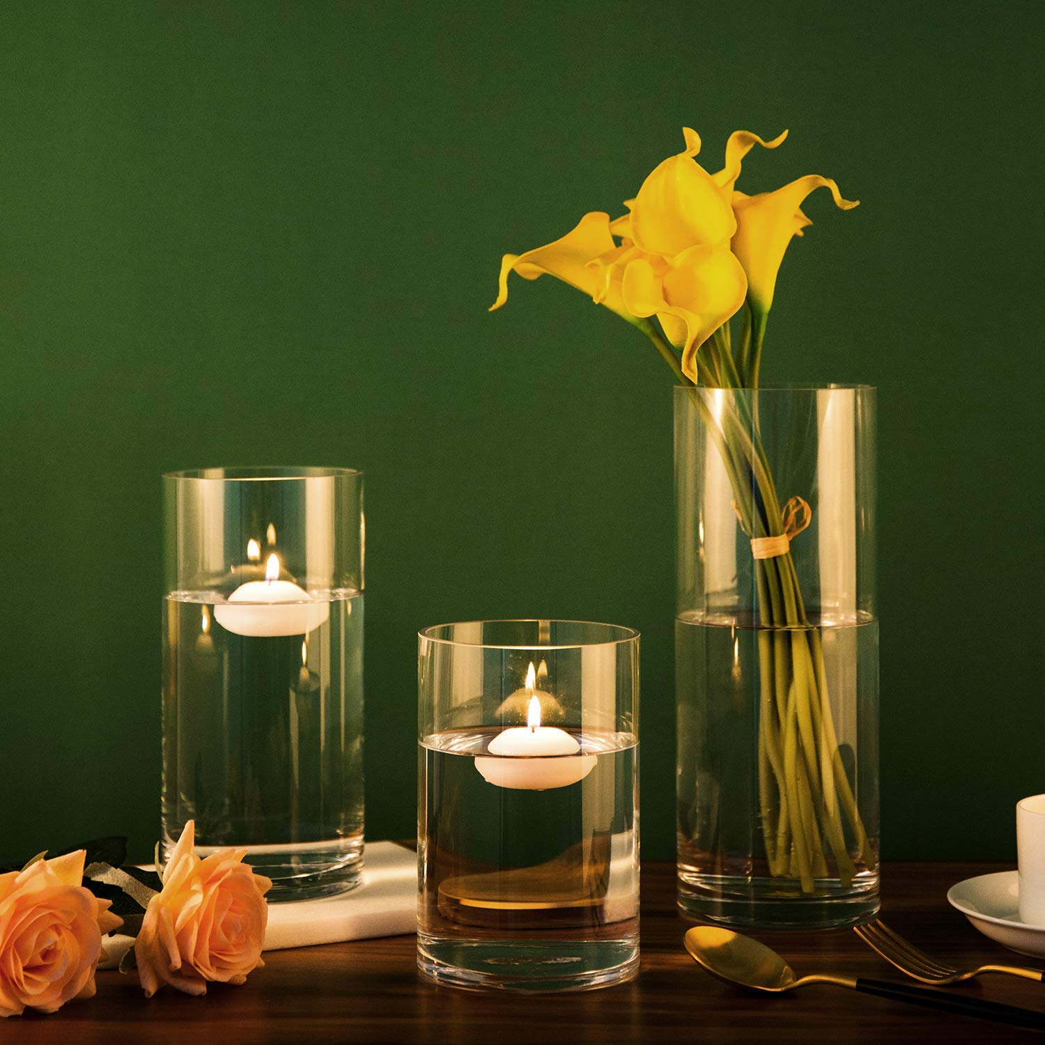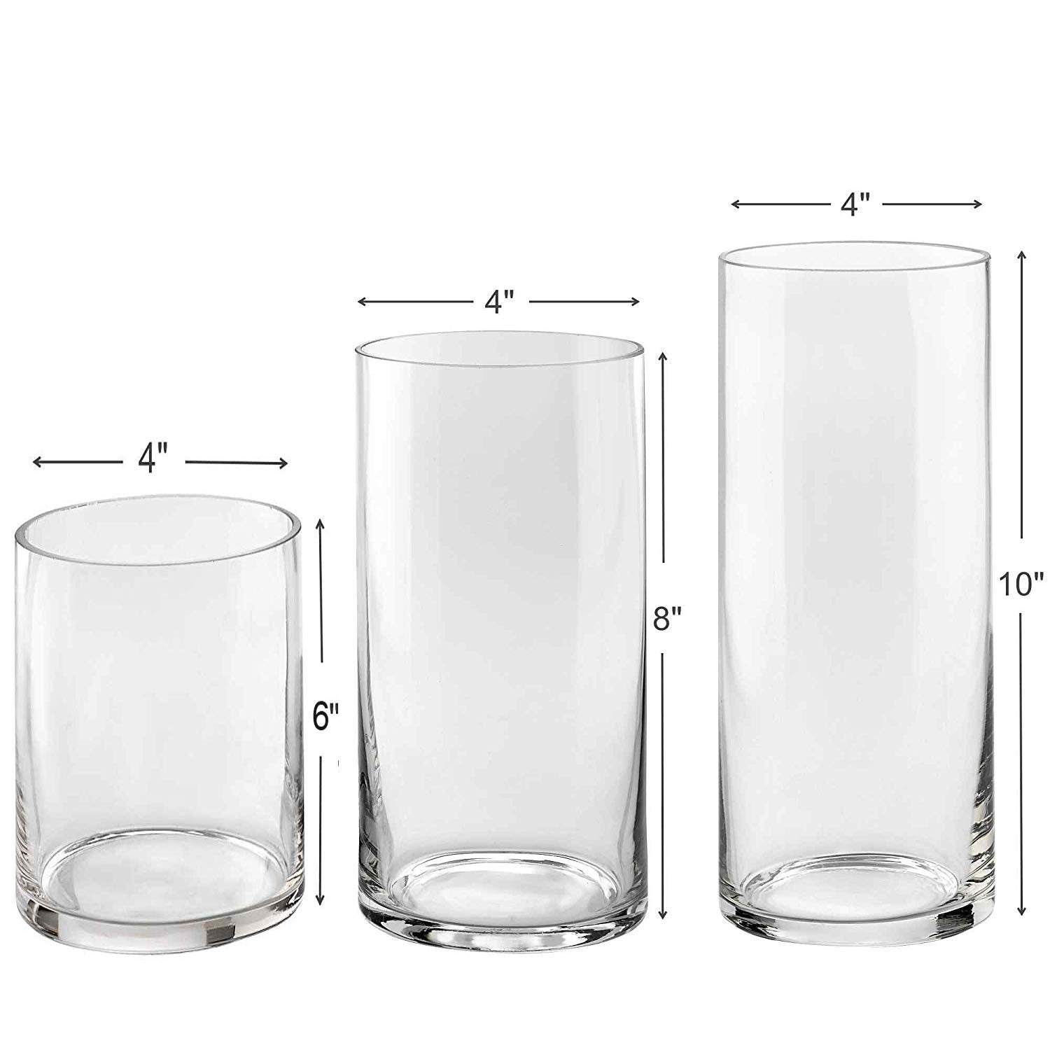 The cylinder vases are 10 cm in Dia & 6", 8" & 10" in height. They are made of thick borosilicate hand blown glass.
