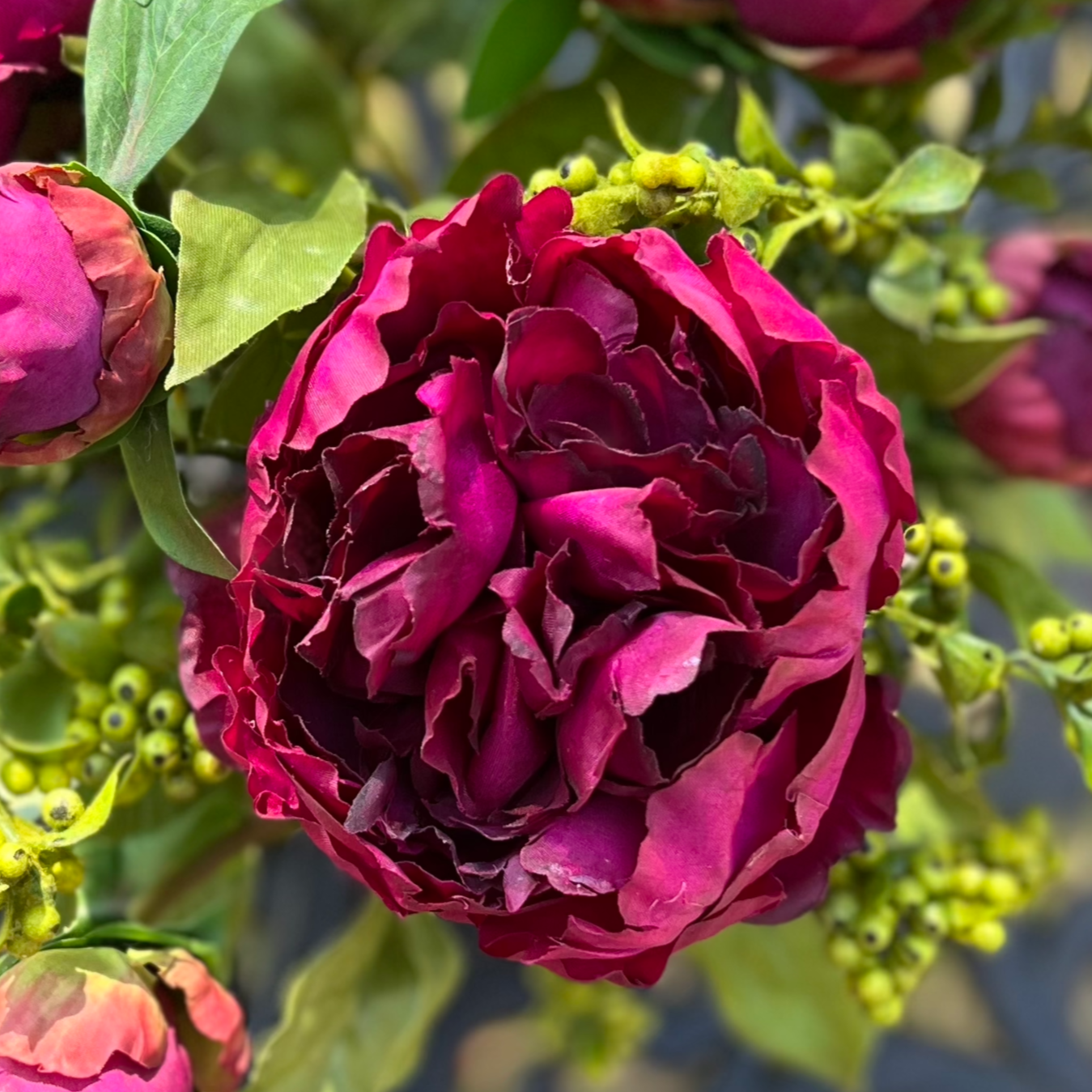 This gorgeous real touch peony arrangement is an elegant accent piece providing the perfect pop of color! Style this arrangement within a room by placing on a nightstand, side table, entry table or use as a centerpiece on a coffee table or small dining table.